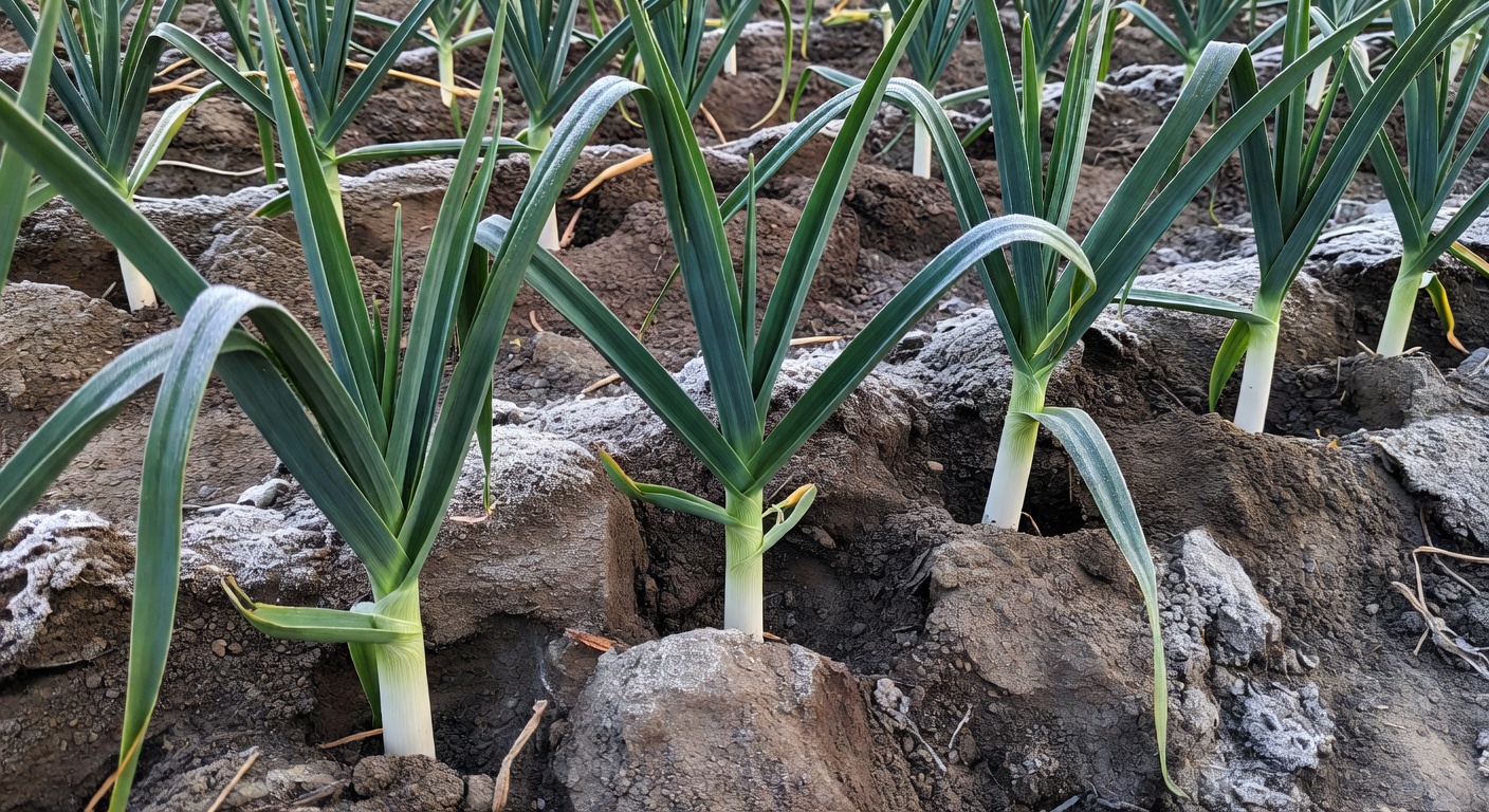 OBSYPYWANIE — kluczowe. Co 3-4 tyg. przysypywać ziemią dolne części łodygi (3-5 cm każdorazowo) — wydłuża białą część. Alternatywa: sadzenie głębokie w dołkach (patrz plantingOutdoor). Pielenie systematyczne. Mulczowanie słomą zachowuje wilgoć.
